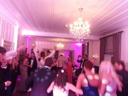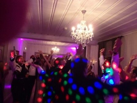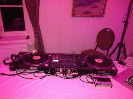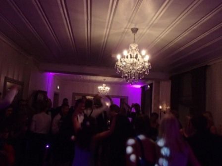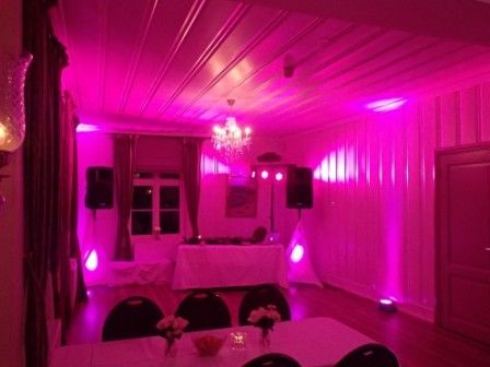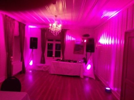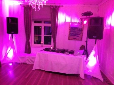 I lokalet plasserte vi 2 stk aktive topp høyttalee på stativ med wrapz dekor foran, 8 stk LED Uplight i lilla farge rundt i lokalet, samt 4 stk LED mot dj og saxofonist. I tillegg en dobbel discolyseffekt mot dansegulvet. Dj Marius brukte for anledningen platespillere med vinylplater koblet opp mot sin mac, noe som var stor suksess.